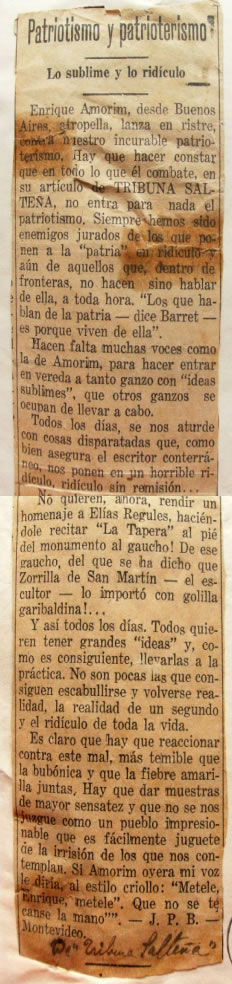 | Diario Tribuna Salteña, Salto, 1933. Artículo firmado con seudónimo J.P.B | |