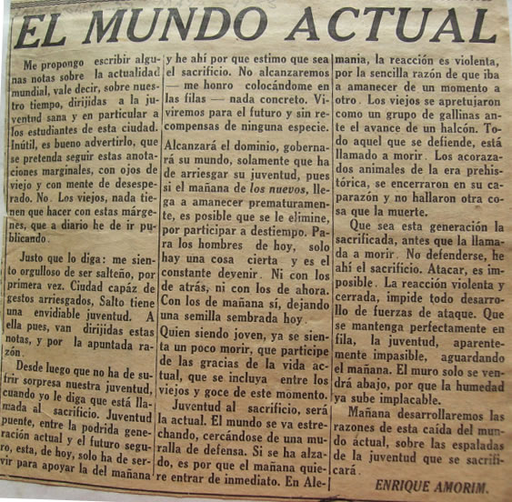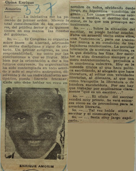 de noviembre 1936. Contestación de Amorim a encuesta relacionada con el Primer Congreso Gremial de Escritores de Argentina organizado por la Sociedad Argentina de Escritores, a iniciarse el 12 de noviembre de 1936. |